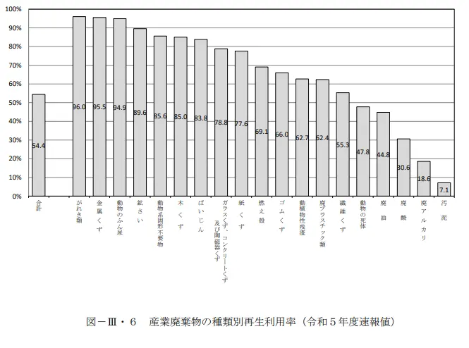 環境省の「令和6年度事業 産業廃棄物排出・処理状況調査報告書 令和5年度速報値(概要版)」によると、がれき類の再利用率は96.0%という高い数値を記録しています。