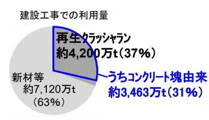実際に建設工事で利用される砕石のうち、再生路盤材は37%にとどまっており、全国的に供給過多の傾向にあることがわかります。資源循環を促進するためにも、路盤材以外の再生用途を拡大し、新たな製品分野への再生資源の活用といった取り組みが求められます。
